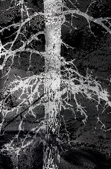 By using dramatic black and white images, I portray the scenes of destruction.  These images are printed on silk that hang from the ceiling and create an experience for the viewer – as if they are walking through the devastated forest.