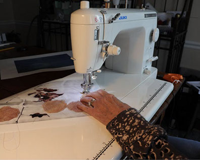 The stitched works are printed on Hahnemühle Rice Paper using a professional Epson printer. The paper’s lightweight structure allows for machine stitching while maintaining exceptional image quality. I often incorporate metallic thread and may add scrim, gauze, metallic Lokta paper, or found objects to enhance texture, rhythm, and depth.