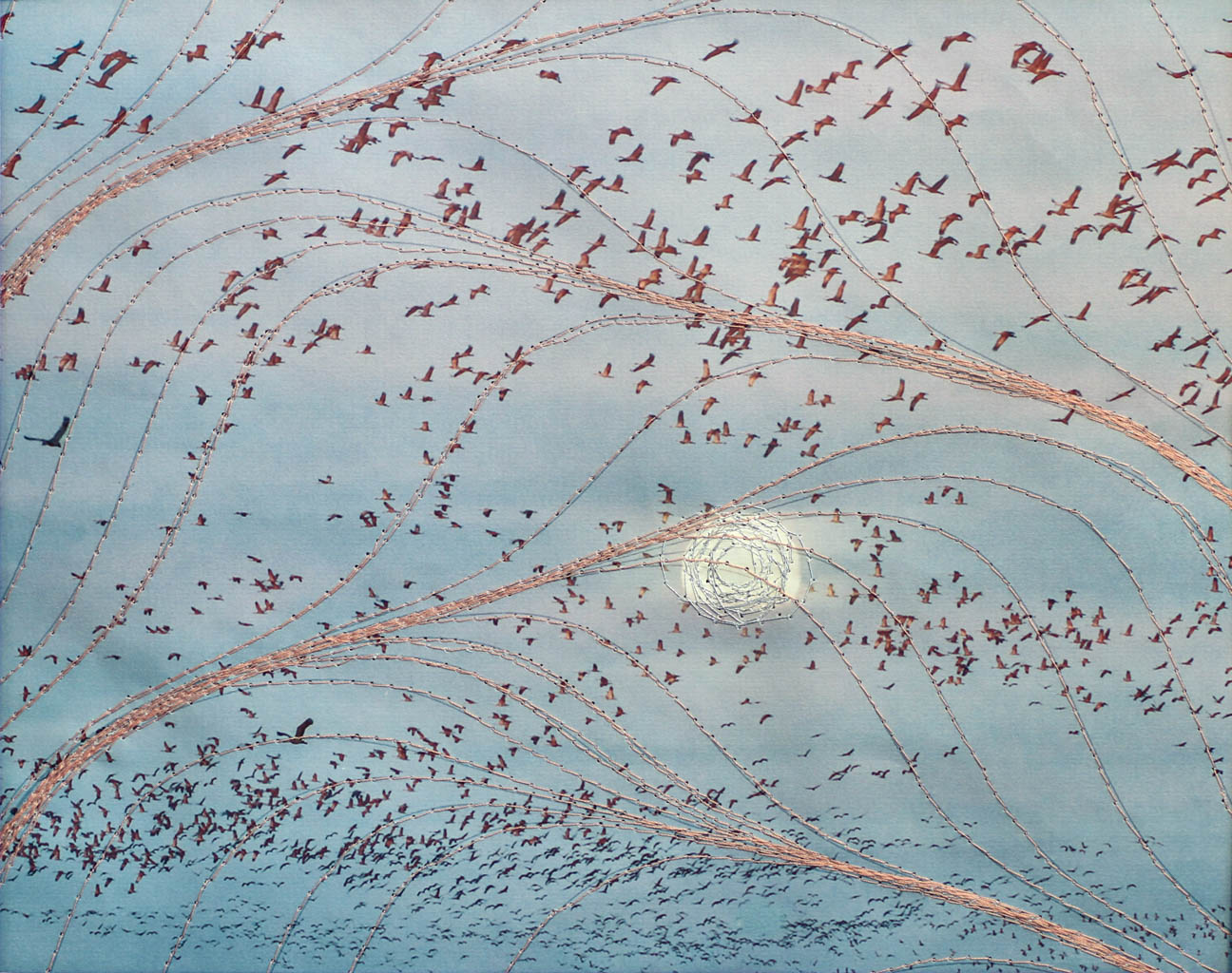 With these images, I combine my two passions – sewing and photography – to create a digital photograph enhanced with texture from stitching and other materials. After selecting the image, I spend time reflecting on the final composition. During this time of contemplation, I make decisions about how to achieve my creative vision letting the uniqueness of the image determine how I will embellish it. Each work has texture; some have movement from loosely hanging threads and some have shine from metallic threads. Each image is unique and one of a kind. With this body of work, I invite the viewer to have a tactile and alive experience with the image and leave with a deeper awareness of the challenges we face as stewards of our fragile earth.