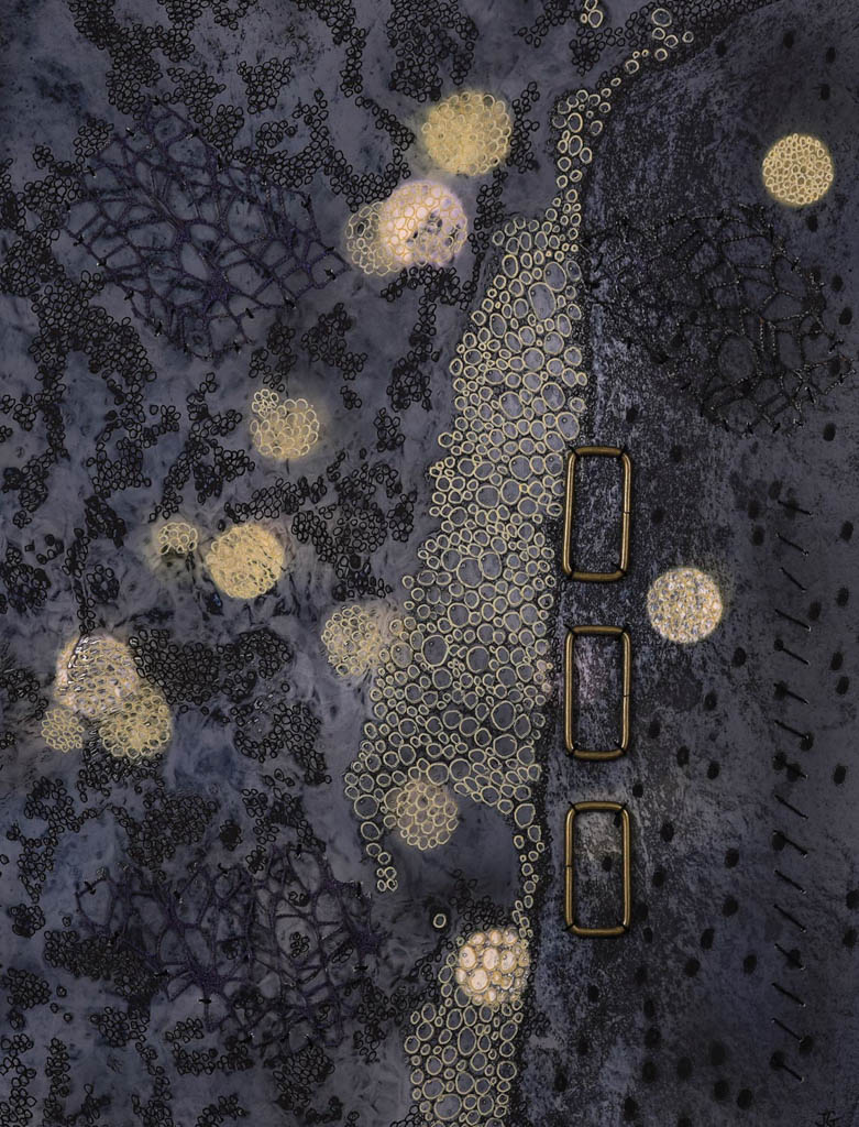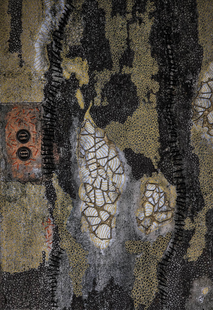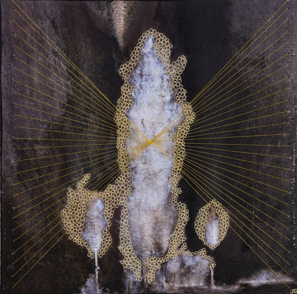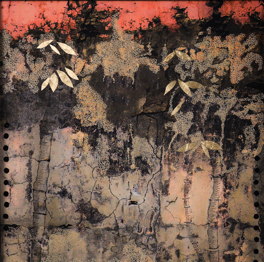 Mixed Media Whispers in Red Tangled World on-off, 2025 Interwoven goldenbubbles Cracks in the Silence Imprinted with Gold Golden closure